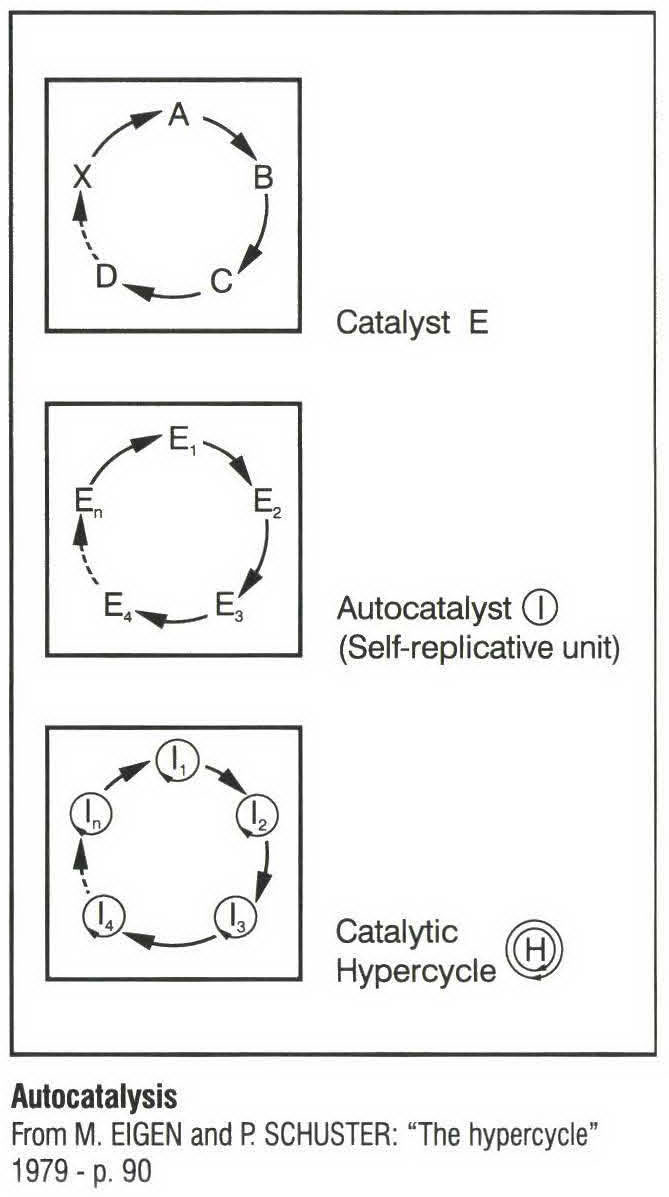 Autocatalysis is basically a self-amplifying process, but moved by a cyclical positive feedback with relaxation phases. It may however lead, in a limited space, either to a destructive supersaturation or, exceptionally to the emergence of a new level of organization of the elements reaching a critical density. K. KRIPPENDORFF observes that: "Autocatalysis is not to be confused with multiplication through production, including self-reproduction in which the growth of the population is an aggregate property of the productive capability of its individual members" (1986, p.5)