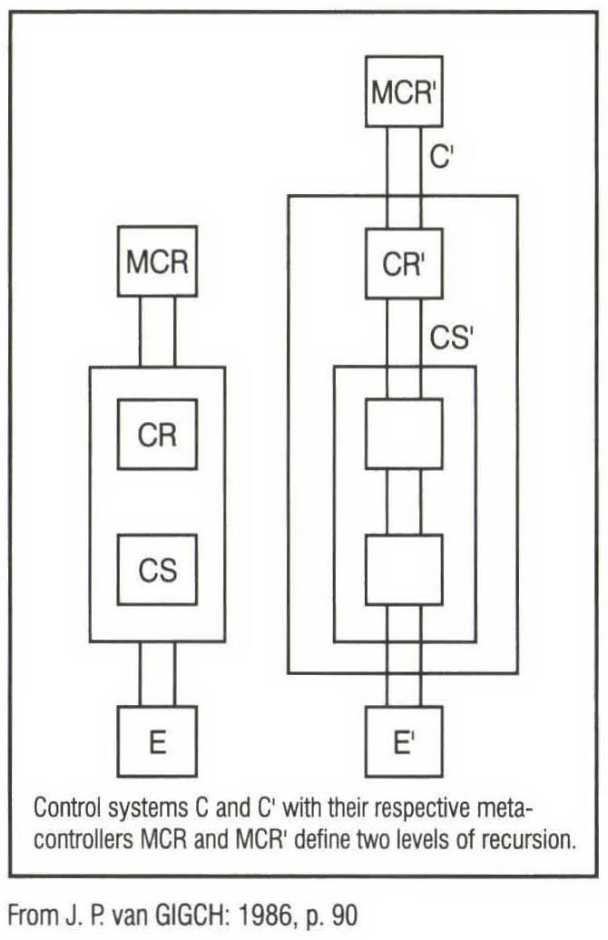 This type of control is proper to hierarchical systems. J.P.van GIGCH explains: "In each control system, control exercised by the controller (CR) is called control at the object level, whereas control exercised by the metacontroller (MCR) is called control at the metalevel or metacontrol. The same denomination applies to subsequent levels of recursion" (1986, p.90).