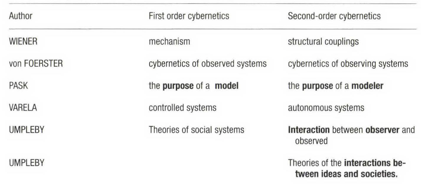 Stuart UMPLEBY explains as follows the differences between Cybernetics of the 1st and 2nd order.