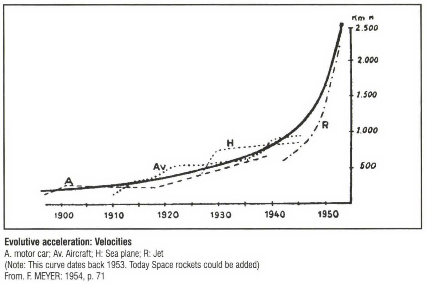 - However, there is a relay mechanism by which, when the evolutive curve of a phenomenon starts to accelerate, some new phenomenon, more powerful, appears. As an example MEYER uses the growth of human displacement velocities from the old horse postal express up to the rocket. Today, he could add the interplanetary explorers.