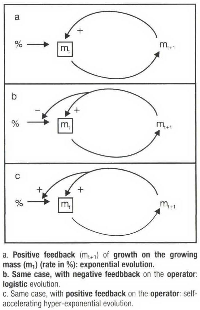 F. MEYER, in "La surchauffe de la croissance" (1974) emphasizes this process, at work in growth of the number of living species and the cephalization index of animal species; growth of human population planetary wide; of population density by square kilometer; of the length of cutting edges per kilo of stone from early paleolithic to late neolithic; of appearance of new types of tools during the same time-span; of urban concentration; of the quantitative use of energy; etc…