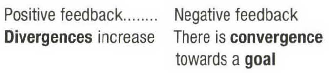 "In any feedback (as its name shows), informations about the results of some transformation or action are sent back at the entry of the system, as data. If these new data tend to make easier or accelerate the transformation in the same direction as the former results, we have a positive feedback: its effects are cumulative. On the contrary, if these new data acts in the direction opposite to the former results, we have a negative feedback: its effects stabilize the system. In the first case, there is an exponential growth or decrease;. in the second one, equilibrium is maintained.