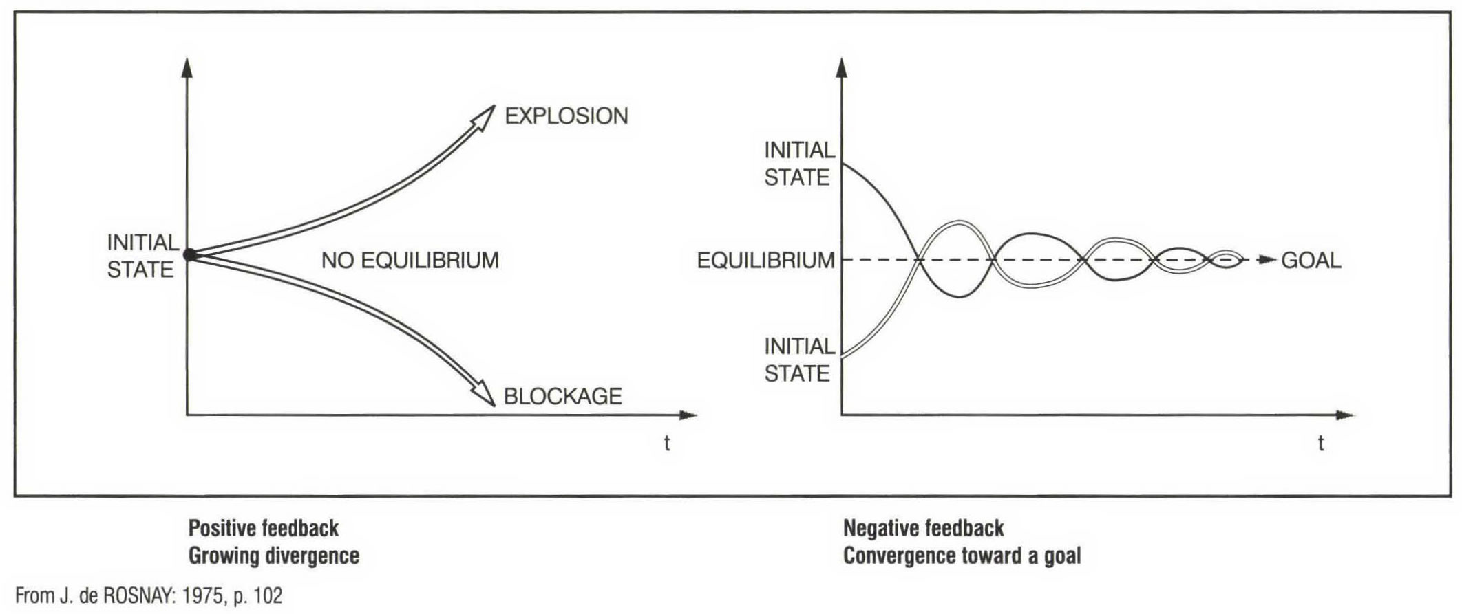 1- Those not familiar with the question tend to associate "positive" with "good" and "favorable" and negative with the contrary. While it is not exactly the opposite way, it is correct that positive feedbacks are generally destructive when repeated, while negative feedbacks (as understood by de ROSNAY) (see below) have regulating and equilibrating effects.