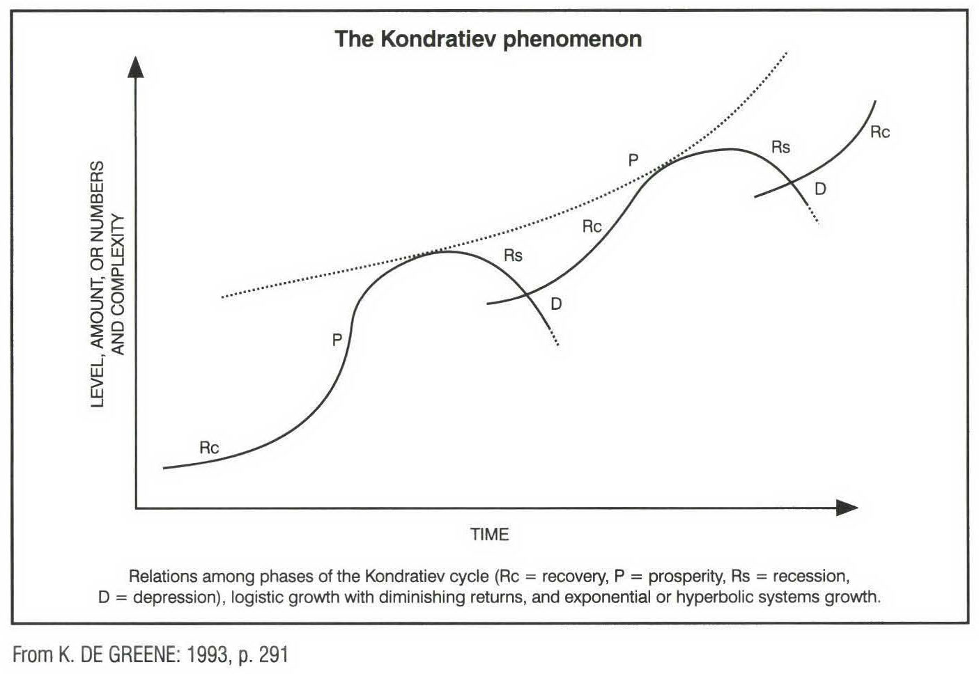 DE GREENE also considers the possibility to develop a theory of KONDRATIEFF waveforms as dissipative structures, in accordance with PRIGOGINE's opinion that all self-organizing systems go through cycles of becoming, growing, changing and decaying (see G. NICOLIS & I. PRIGOGINE, 1977).
