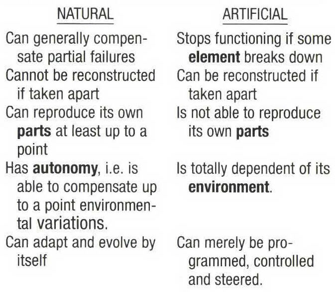 To put some order and avoid dubious isomorphies, it is possible to establish a comparison between specific characteristic of so called "natural" machines and artificial ones.