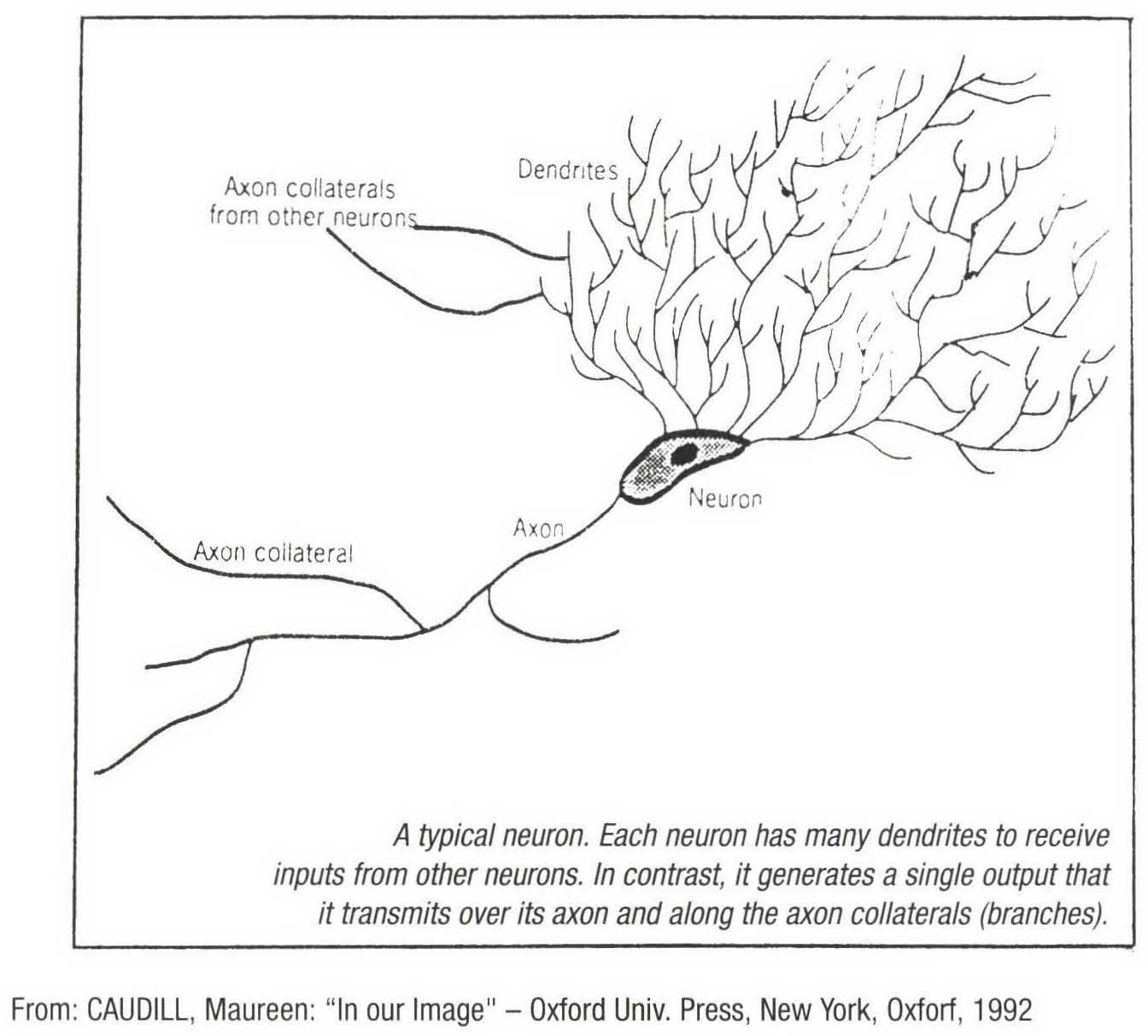 Neurons communicate with each others through intervals called synapses (where complex biochemical exchanges take place), and within very intricated networks, particularly in the neocortex, the most organized part of the human brain.