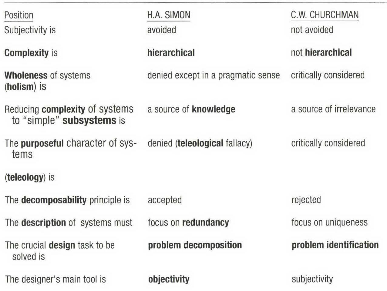 W. ULRICH (1983, p.321-3) has imagined a hypothetical debate between H.A. SIMON and C.W. CHURCHMAN, two outstanding systemists whose views are at odds on a number of points. ULRICH extracted the elements of this fictitious debate from SIMON's "Science of the Artificial" and from CHURCHMAN's "The Artificiality of Science ". Hereafter, a short summary of this debate (on which thesis ULRICH obtained both supposed contenders' agreement):
